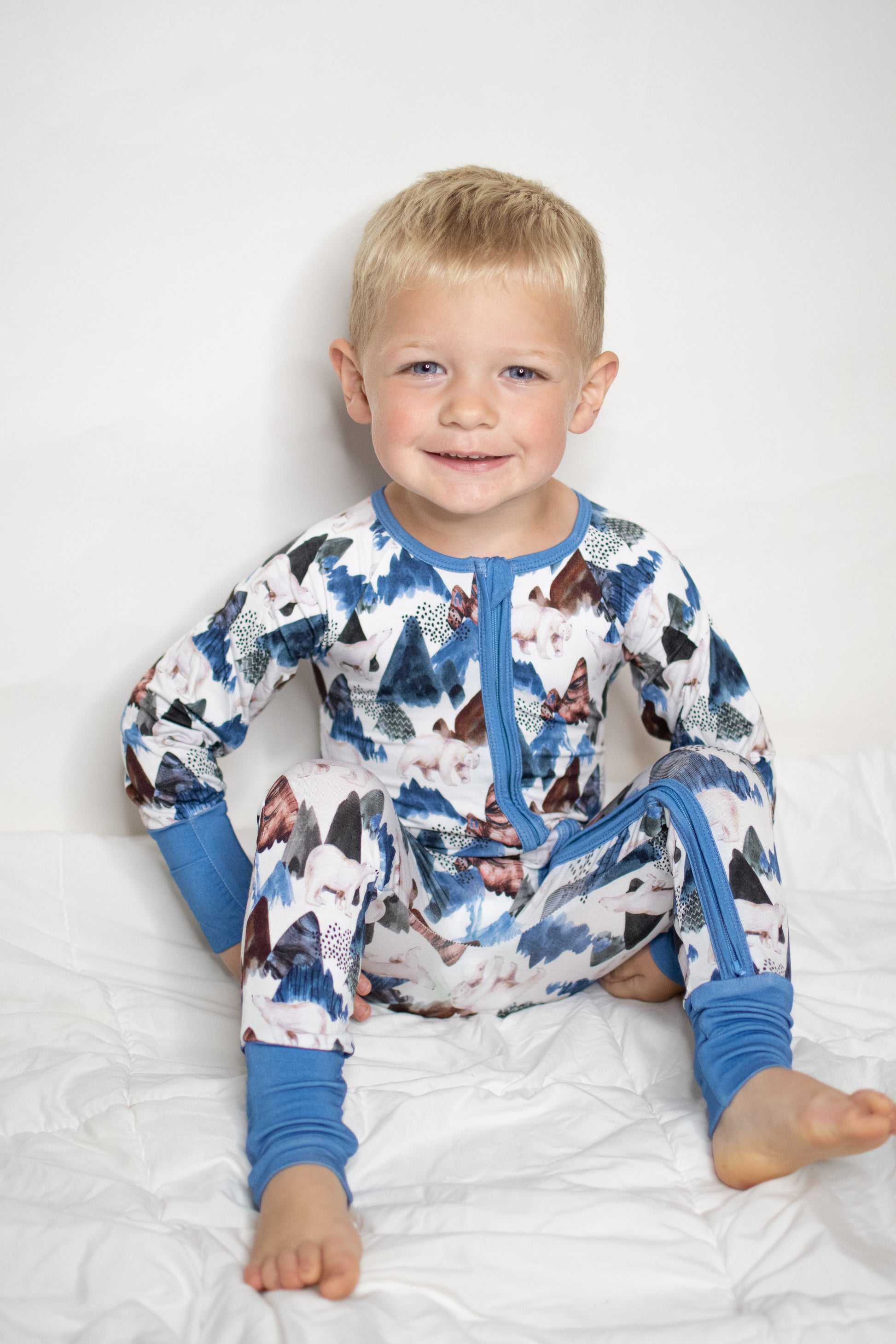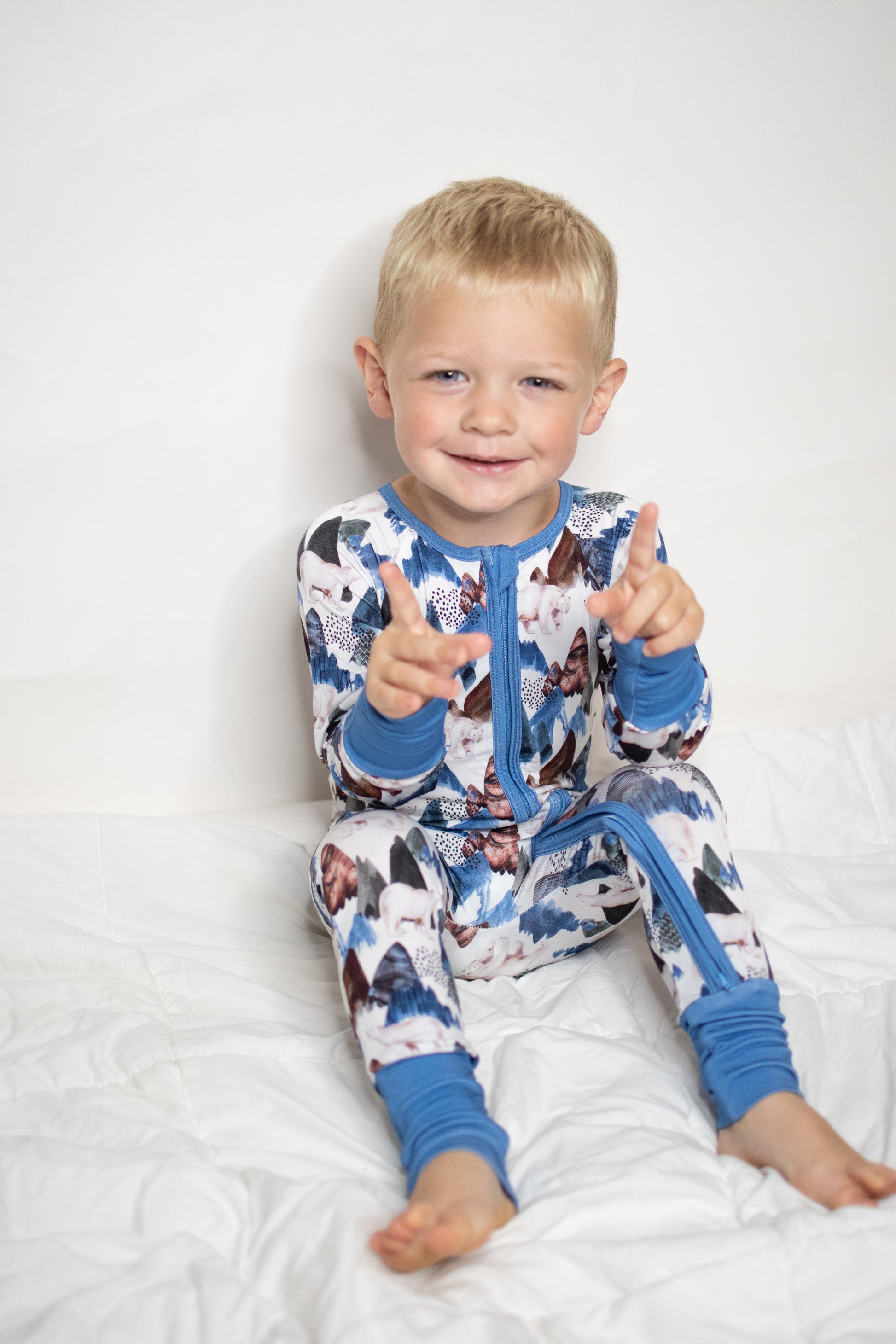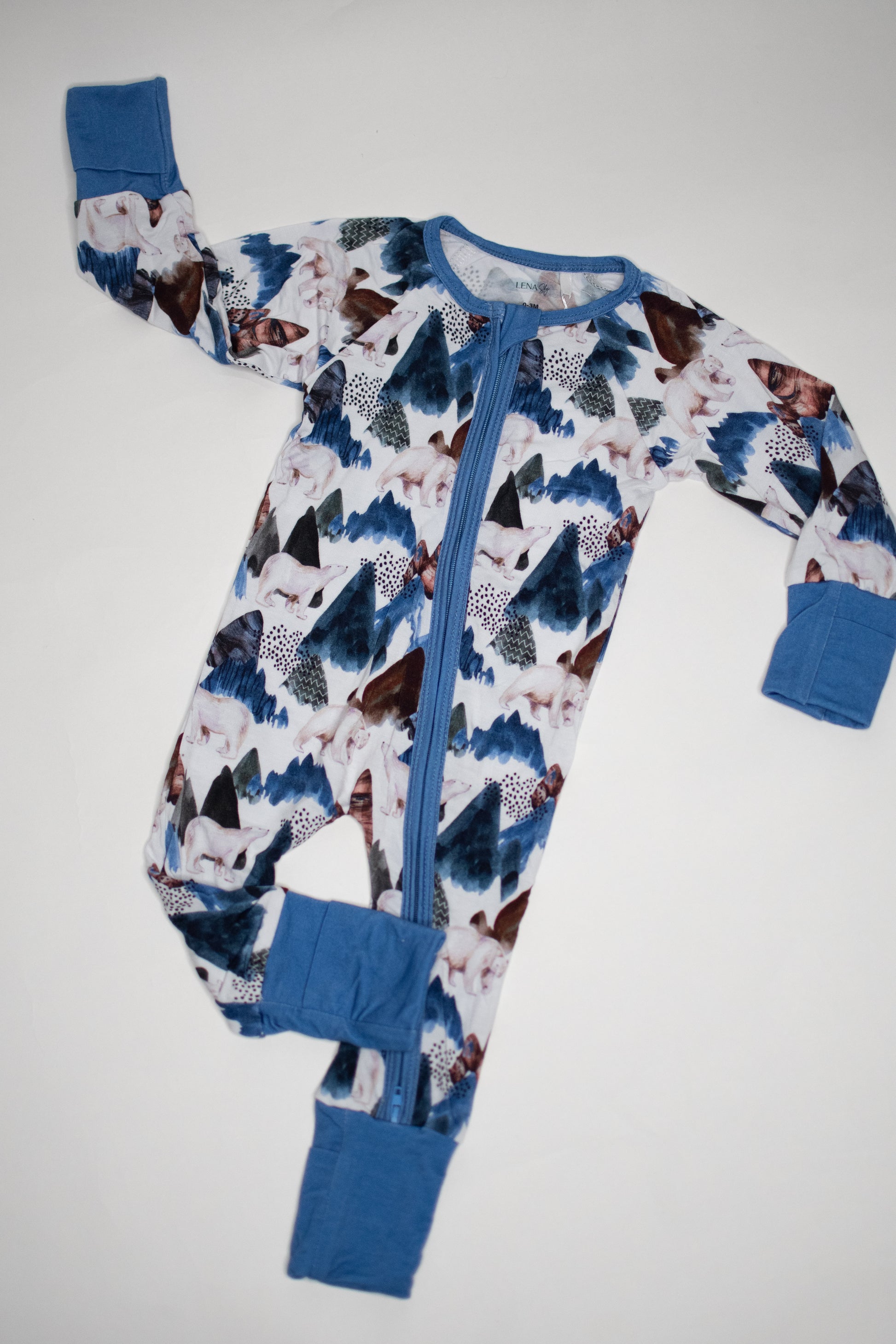 This adventurous print is made for little explorers! Featuring hand-painted mountain peaks in earthy browns, forest greens, and cool denim blues, it sets the scene for a wild woodland journey. Scattered among the peaks are soft, cuddly bears and whimsical textures, bringing the outdoors to life in the coziest way. Finished with rich blue cuffs and a matching zipper, it’s the perfect pajama for bedtime stories full of mountain magic and bear-y sweet dreams!