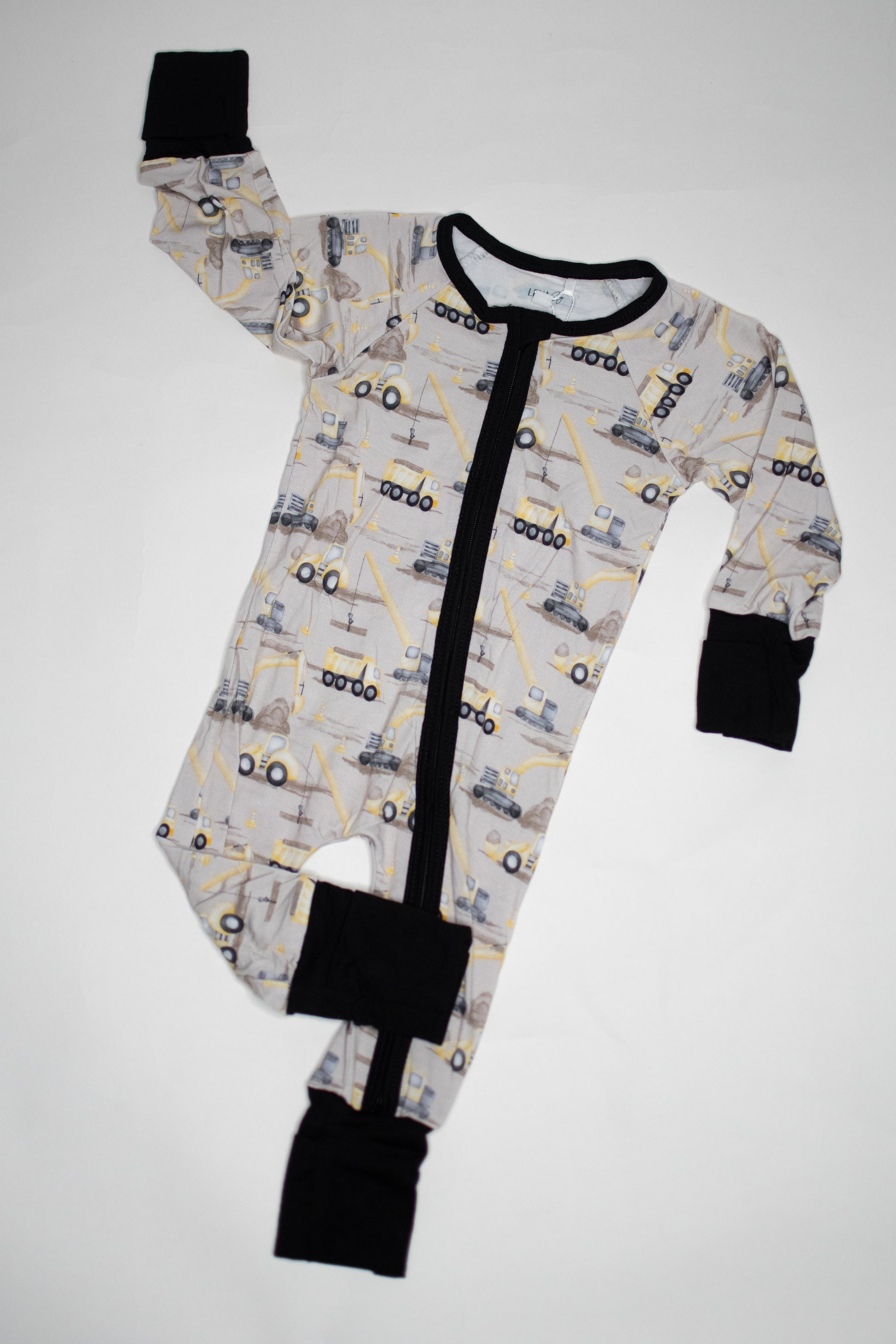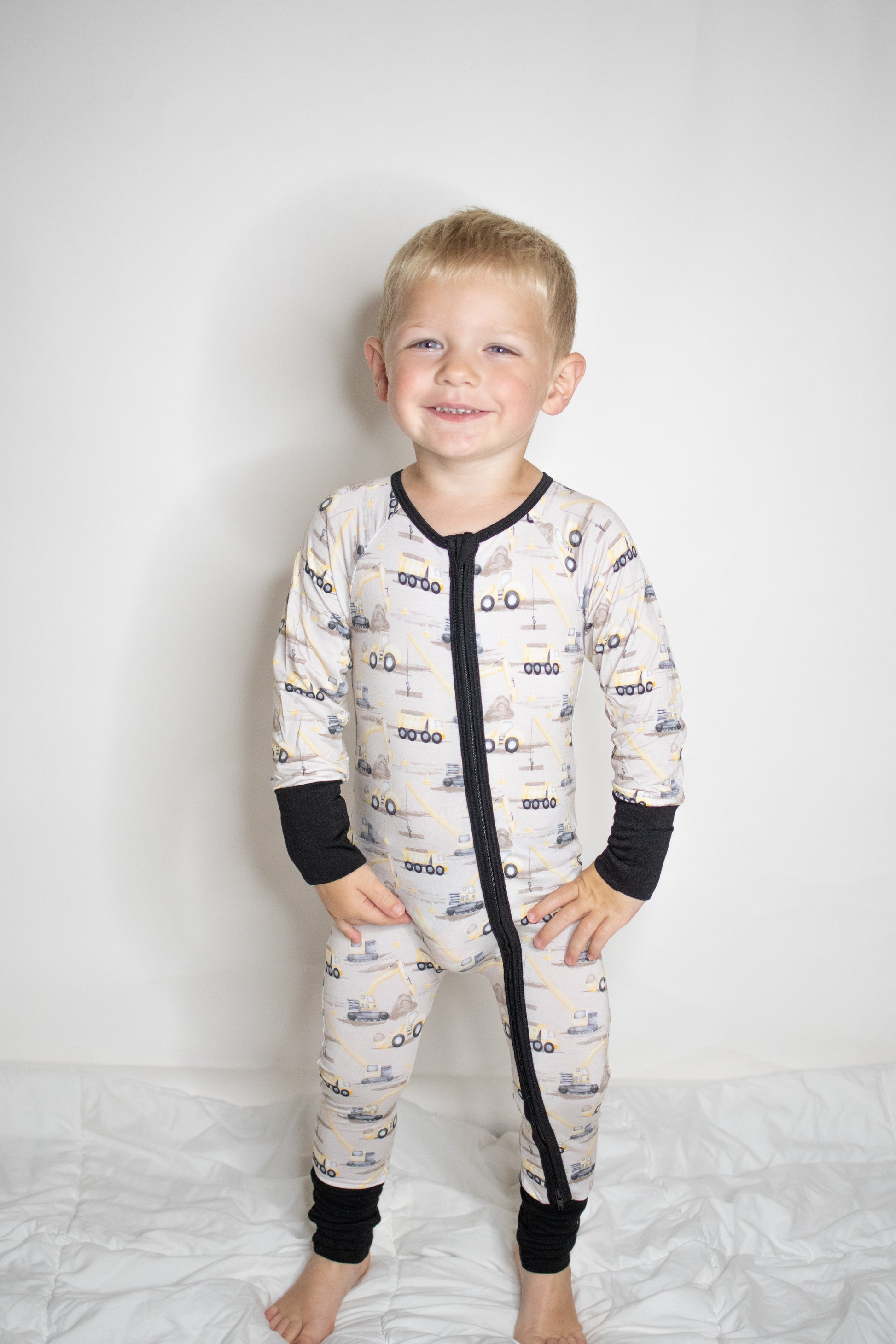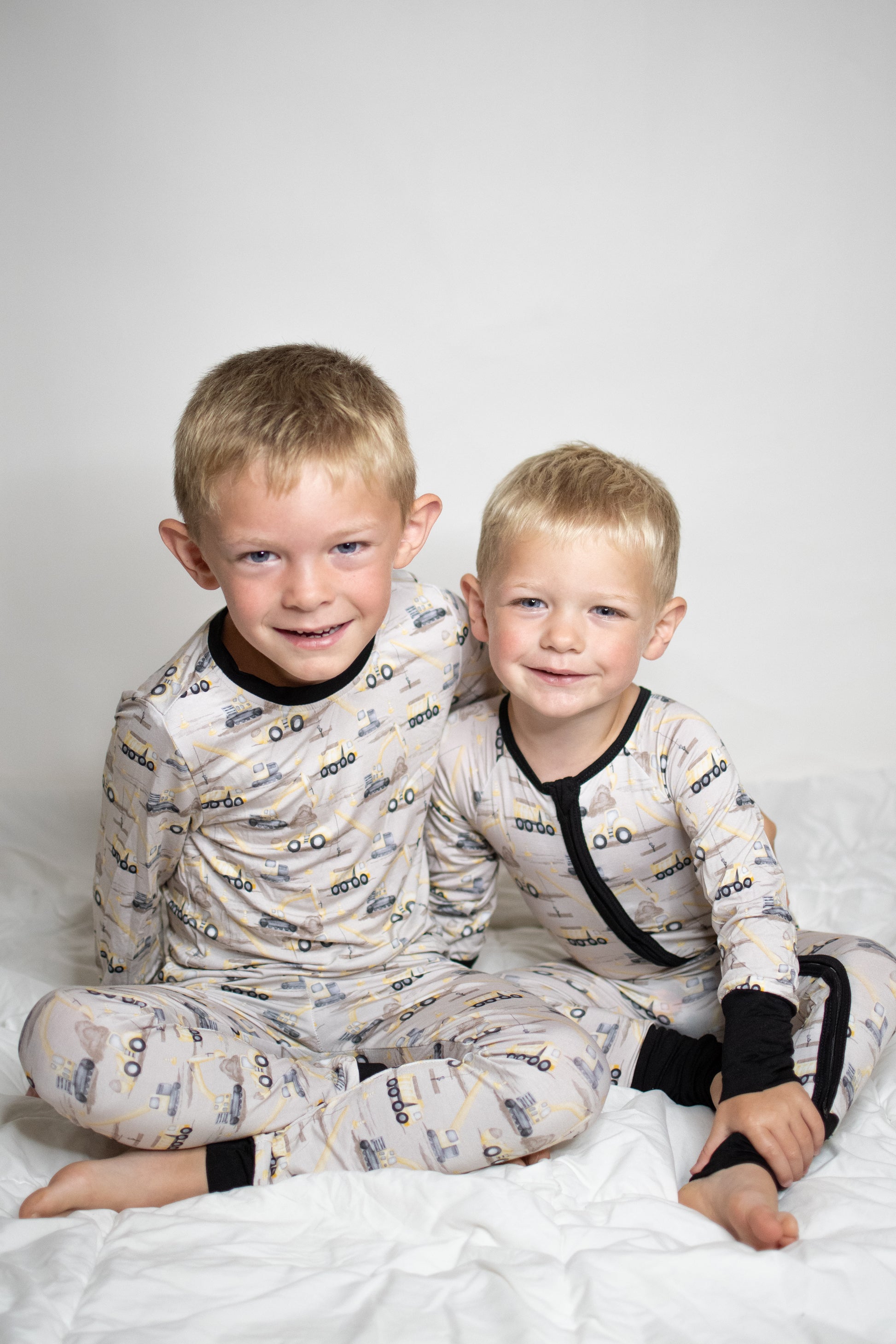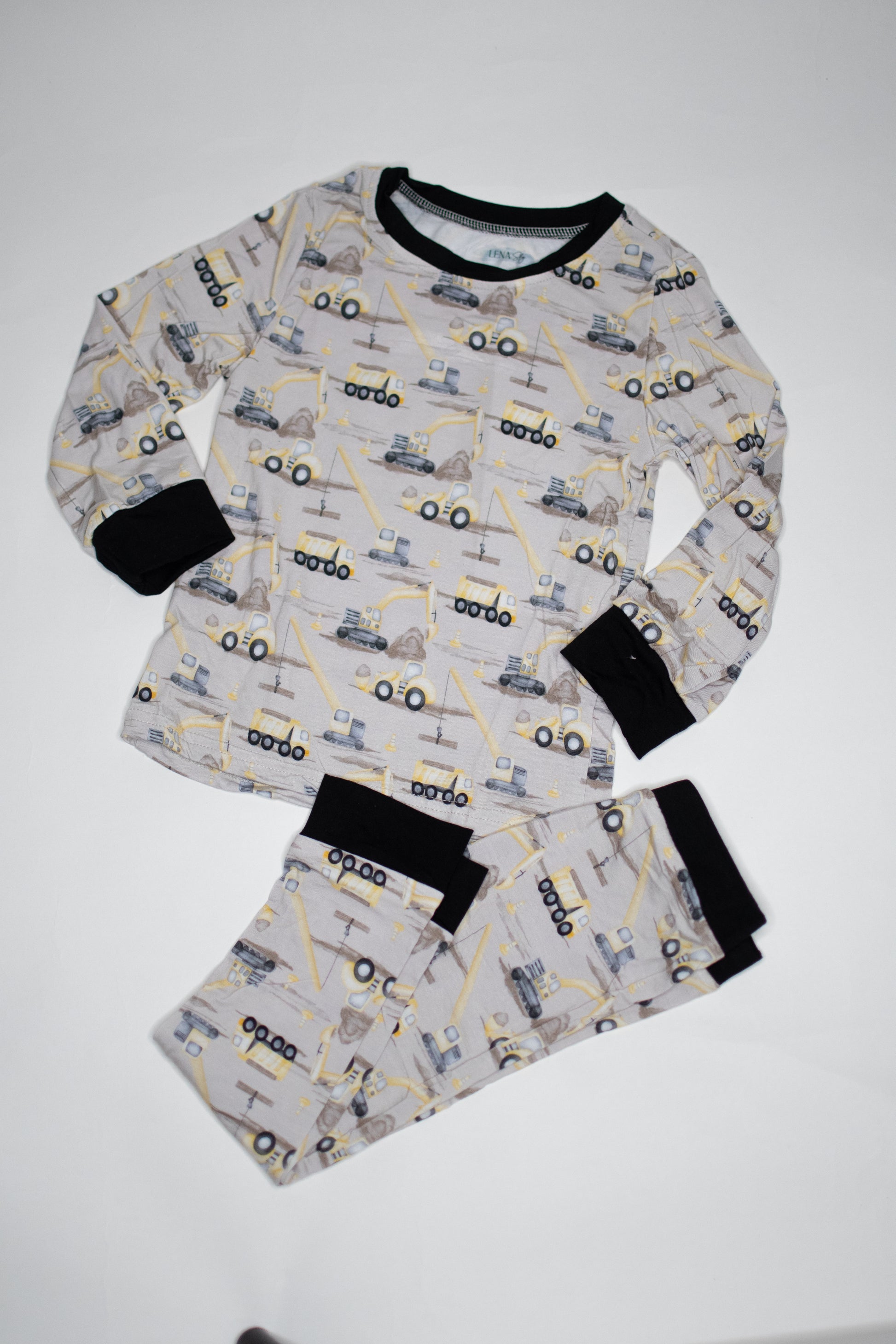 This print is built for the big dreamers who love all things construction! Featuring detailed illustrations of diggers, dump trucks, and cranes in soft, neutral tones of gray and mustard, it’s perfect for little ones who can’t get enough of trucks and tools. Set on a warm beige background with bold black cuffs and collar for contrast, it’s a cozy combo of comfort and cool. Whether they’re building forts or heading off to bed, this set is ready for action!