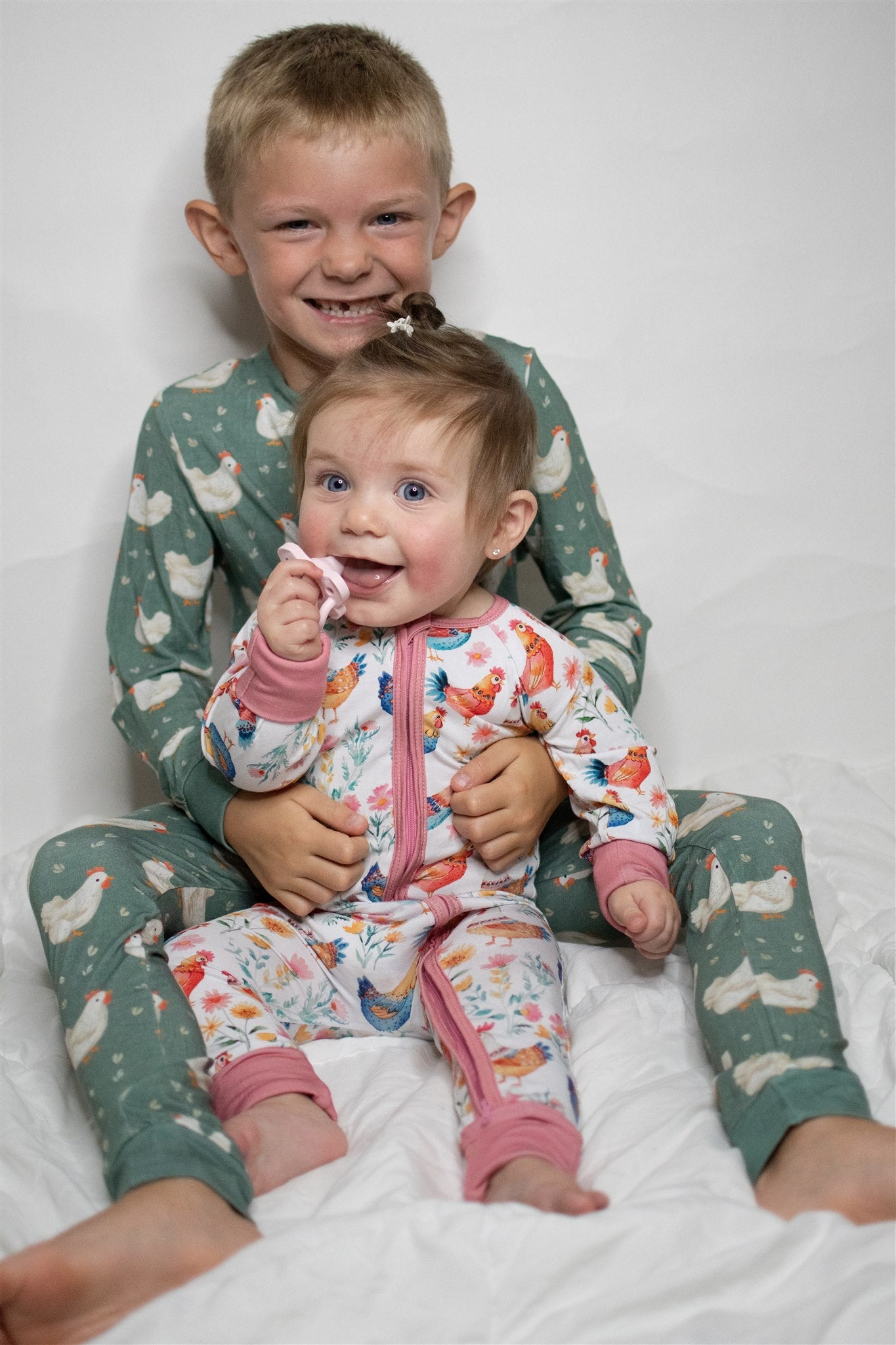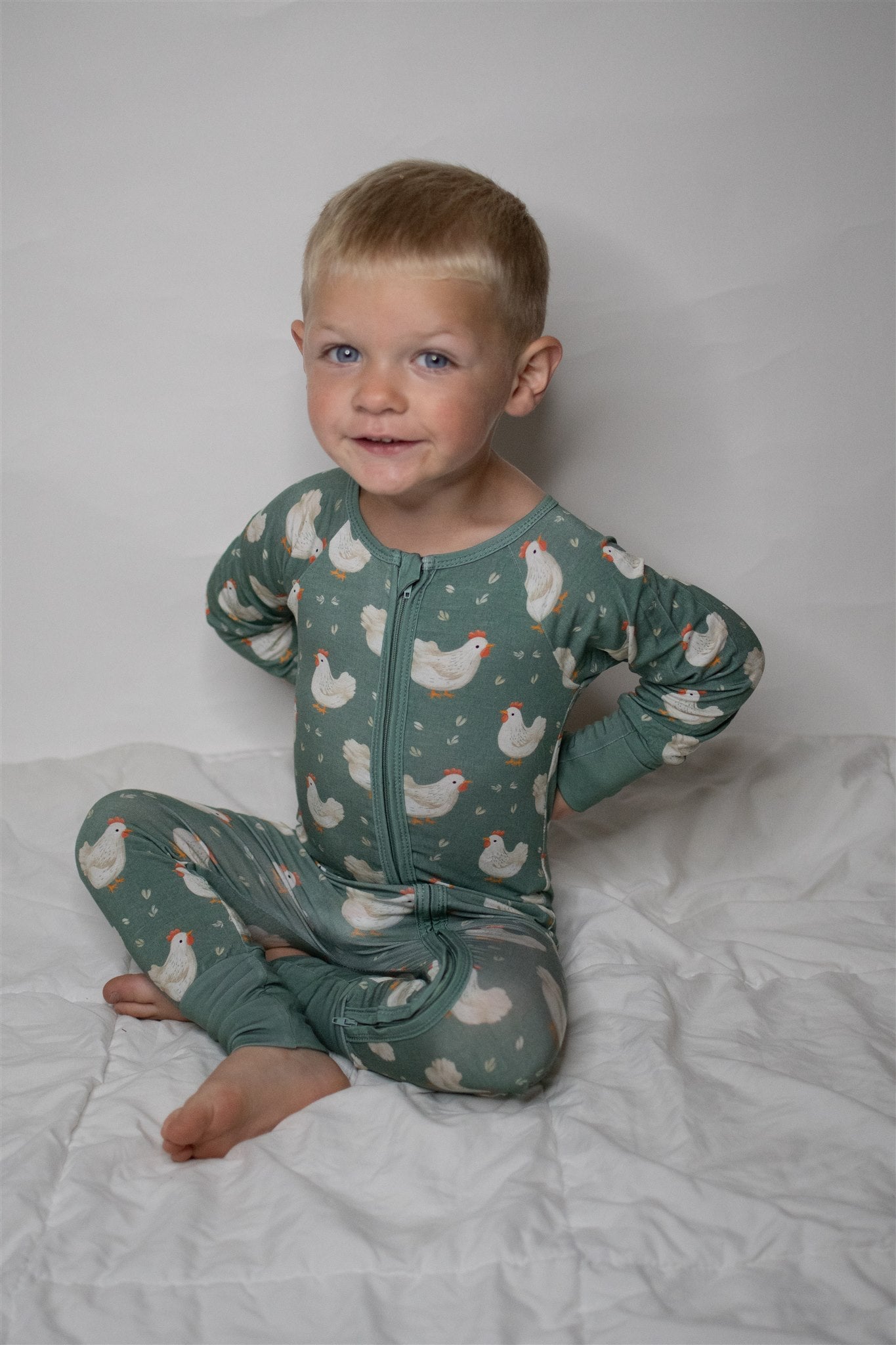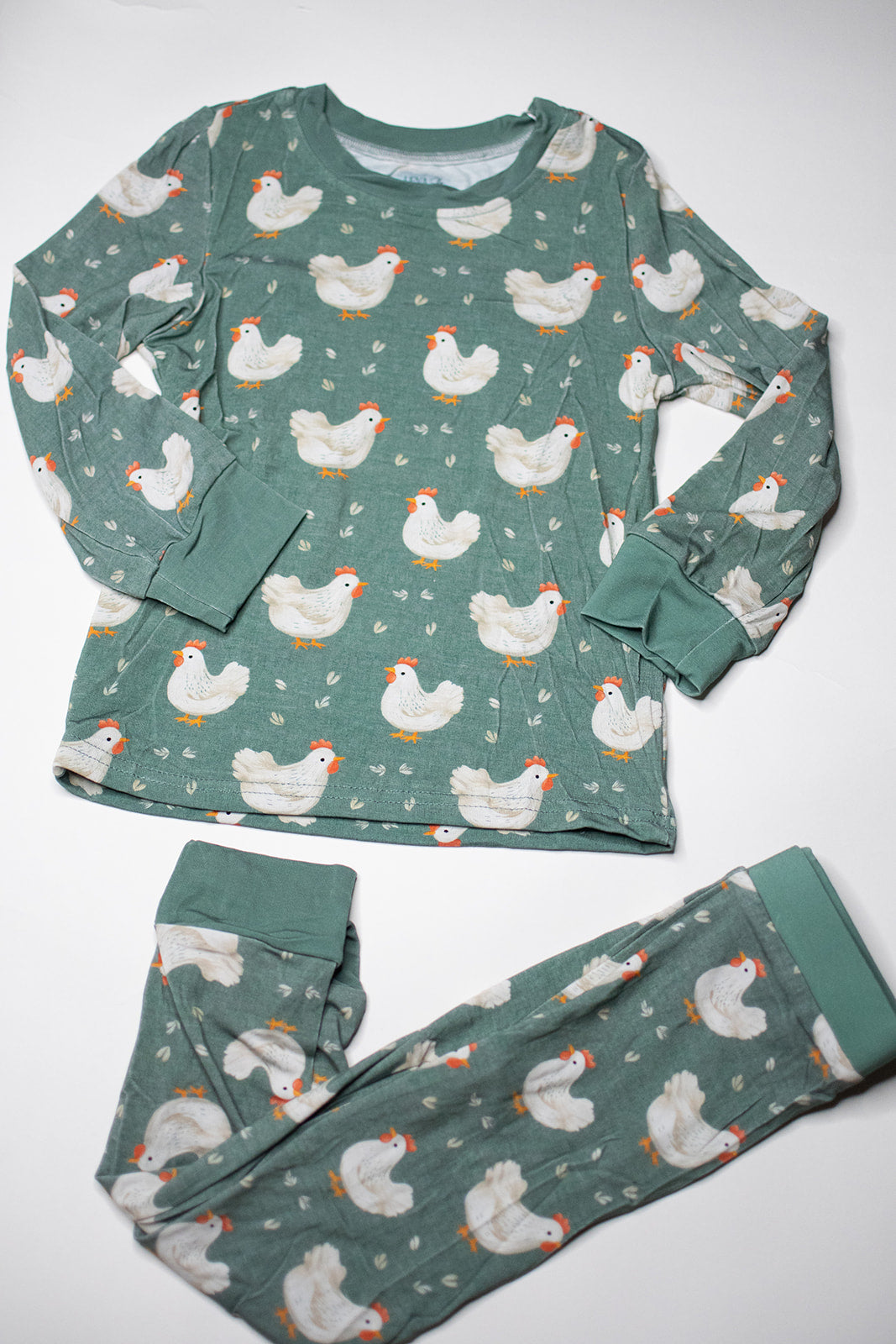 This charming bamboo print features soft white hens with bright orange combs, scattered across a warm sage-green backdrop. Cozy, breathable, and full of farmhouse sweetness, it’s the perfect blend of country charm and everyday comfort for your little.