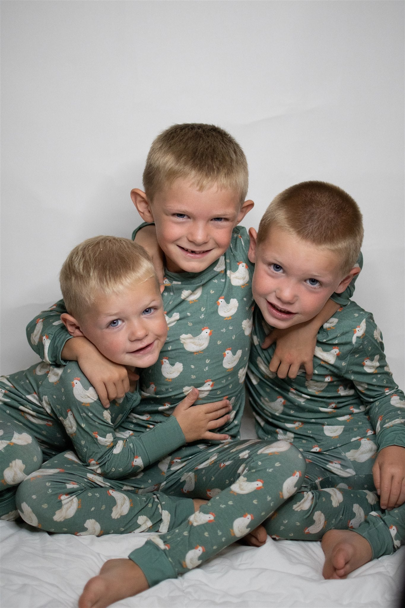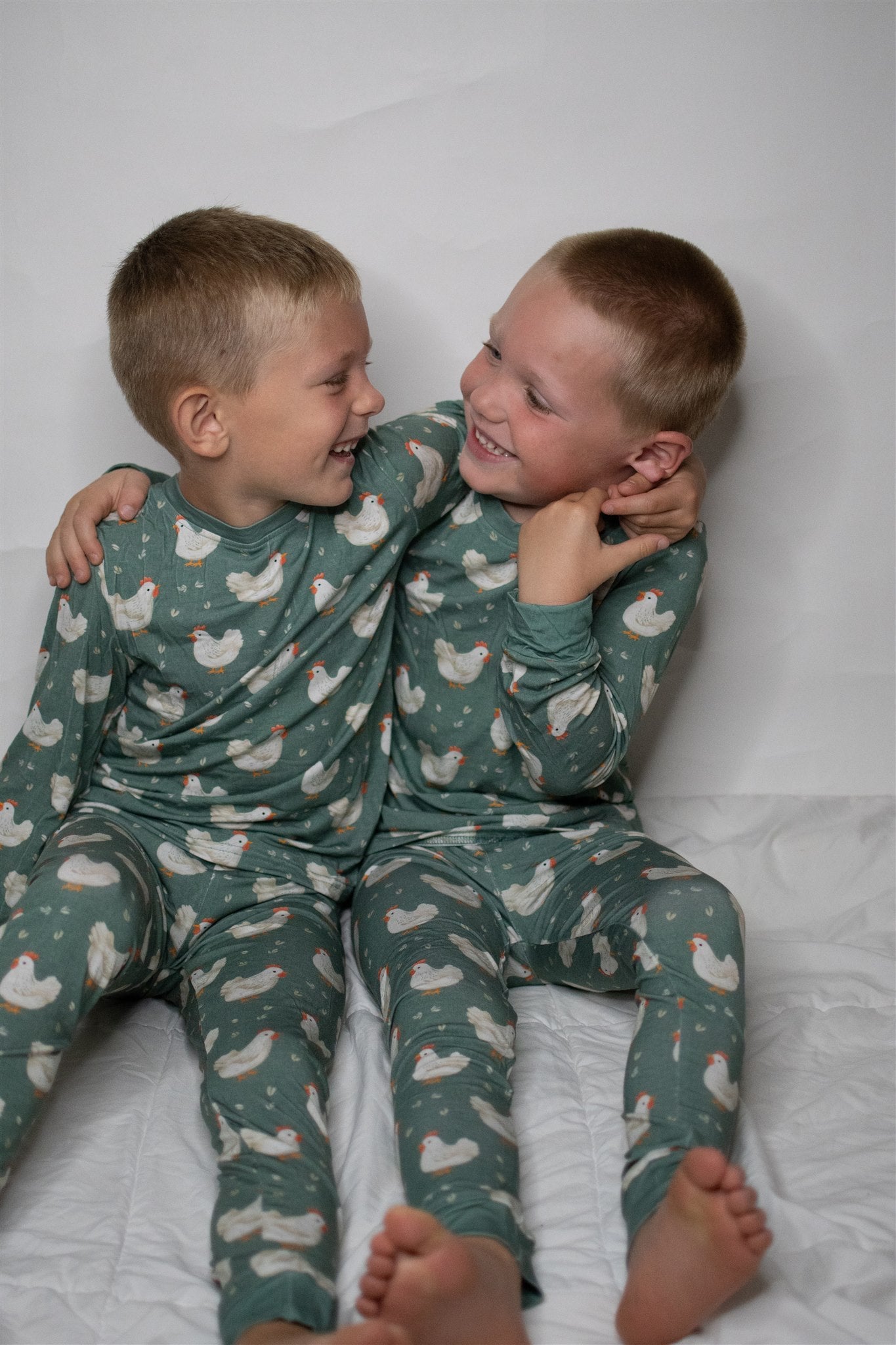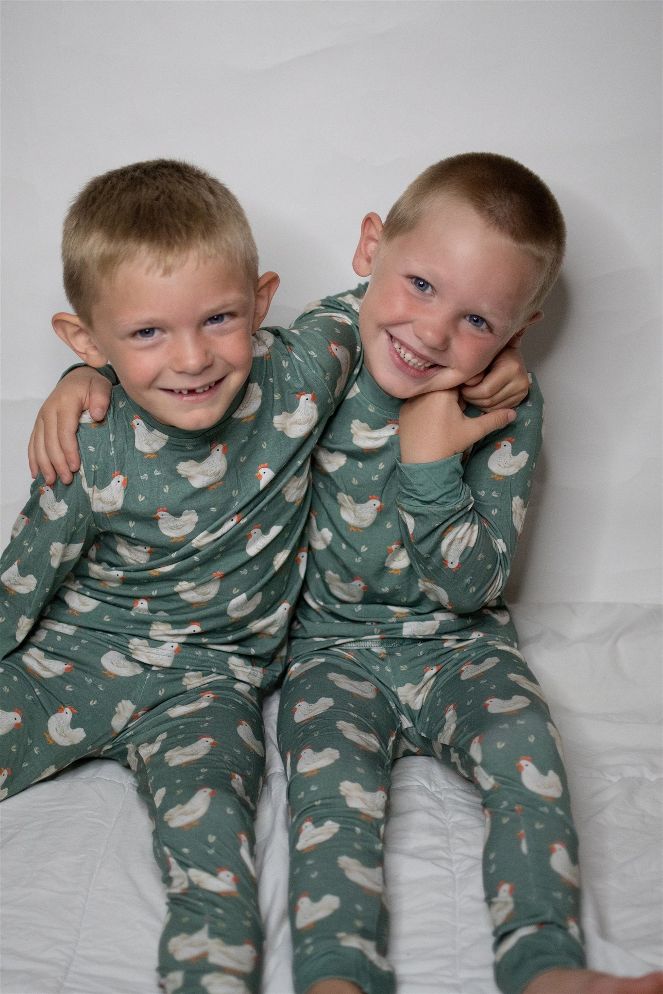 This charming bamboo print features soft white hens with bright orange combs, scattered across a warm sage-green backdrop. Cozy, breathable, and full of farmhouse sweetness, it’s the perfect blend of country charm and everyday comfort for your little.