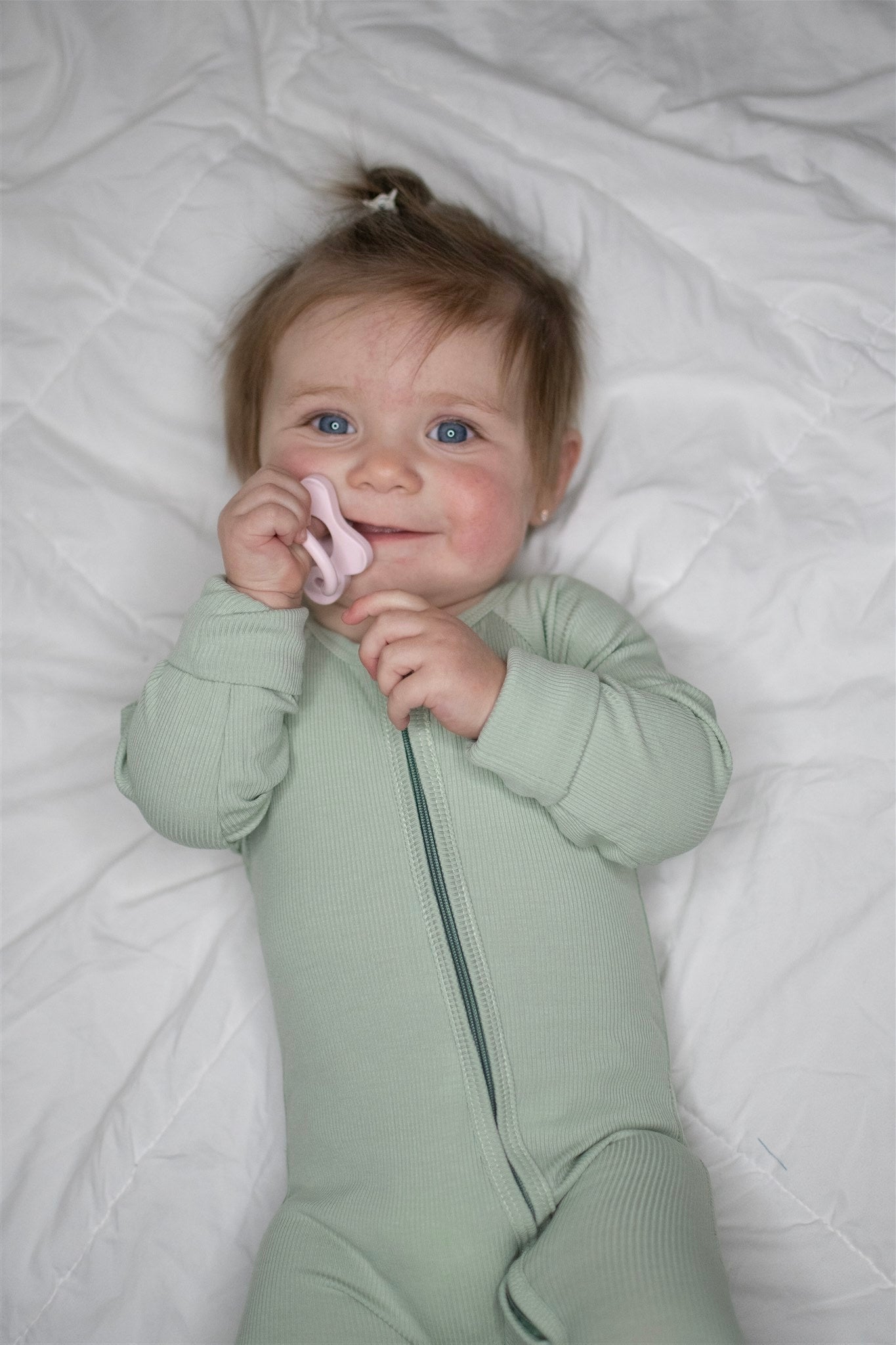 A calming shade of soft sage green, this ribbed bamboo sleeper is as fresh and gentle as a new leaf in spring. Perfectly gender-neutral, its cozy ribbed texture adds an extra touch of charm for everyday snuggles and sweet dreams.