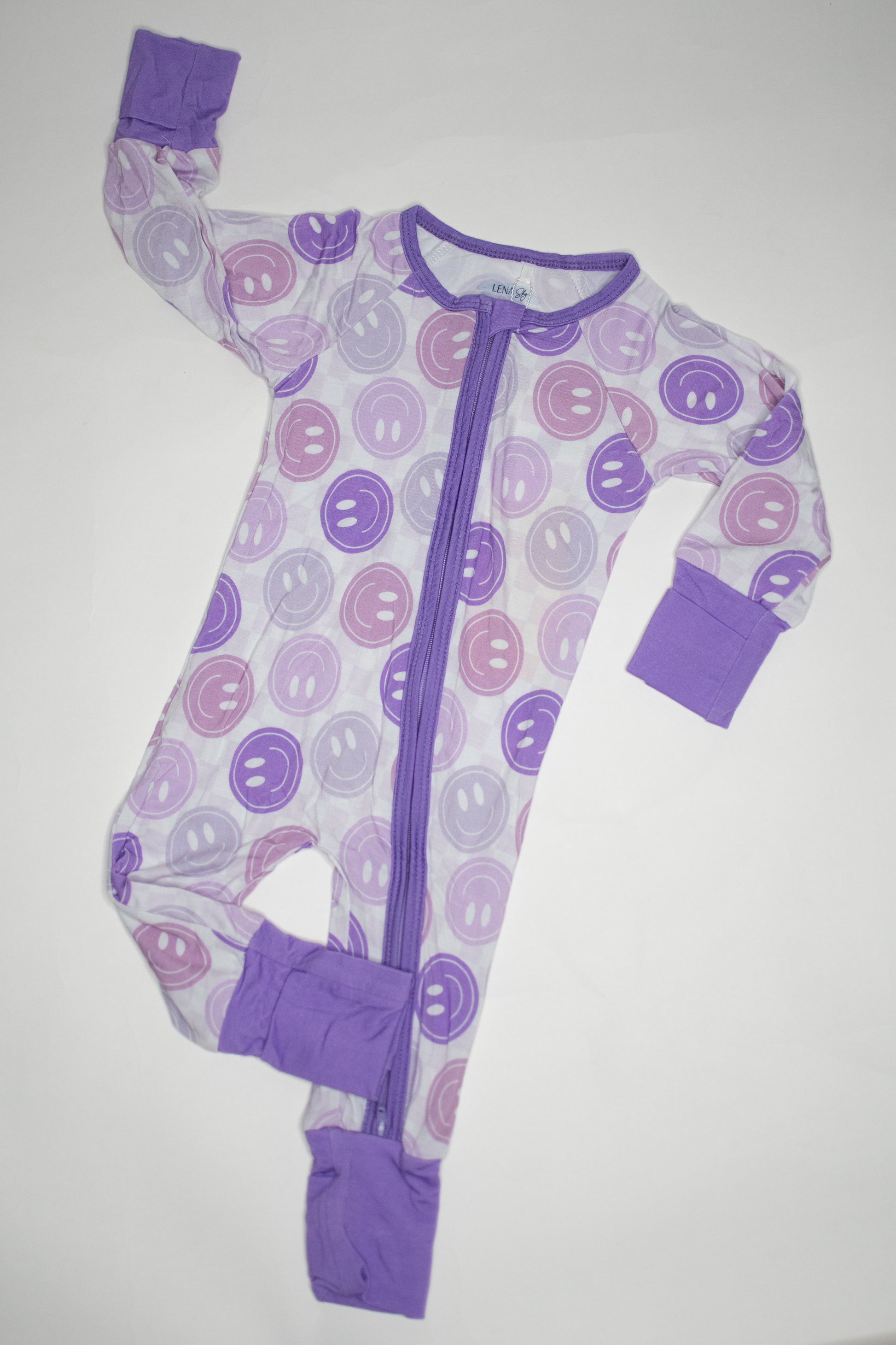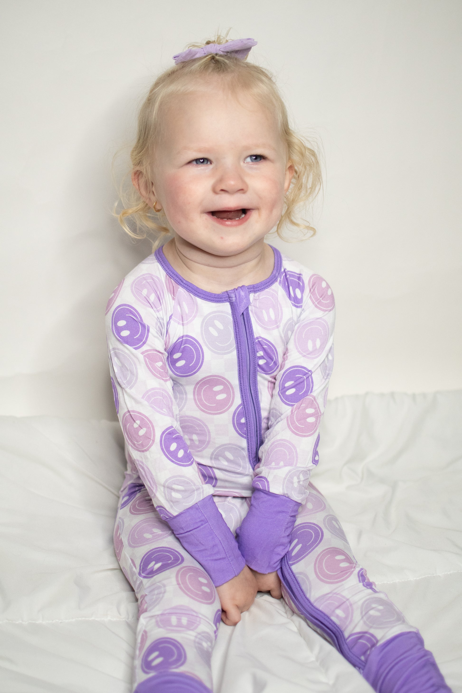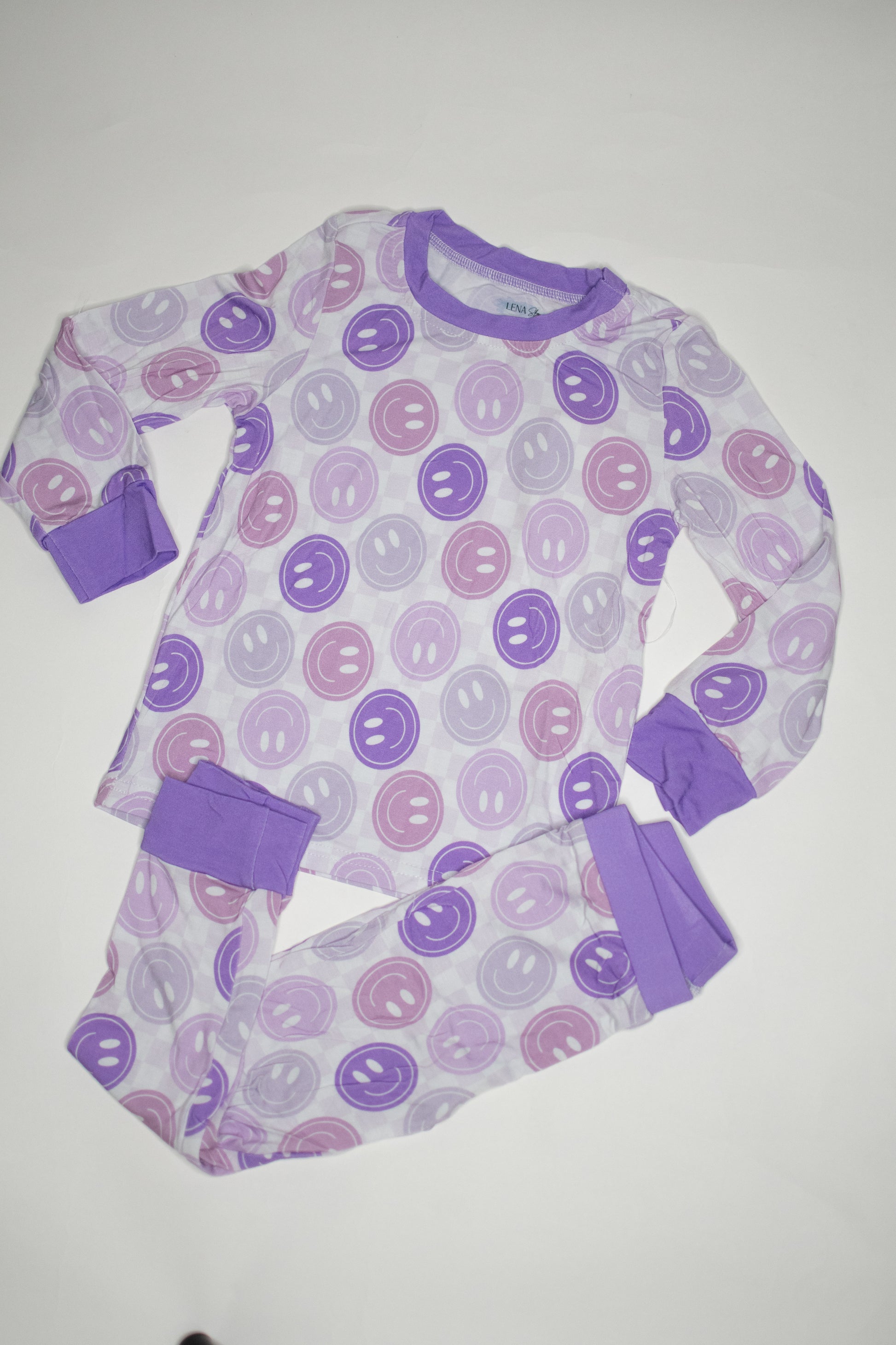 This playful print brings all the happy vibes! Featuring a repeating pattern of cheerful smiley faces in soft lavender, lilac, and dusty pink tones, it’s a fun-loving design that radiates positivity. The light background makes the pastel smiles pop, while the solid purple cuffs and collar add a sweet finishing touch. It’s the perfect pajama set for little ones who light up the room with their joy!