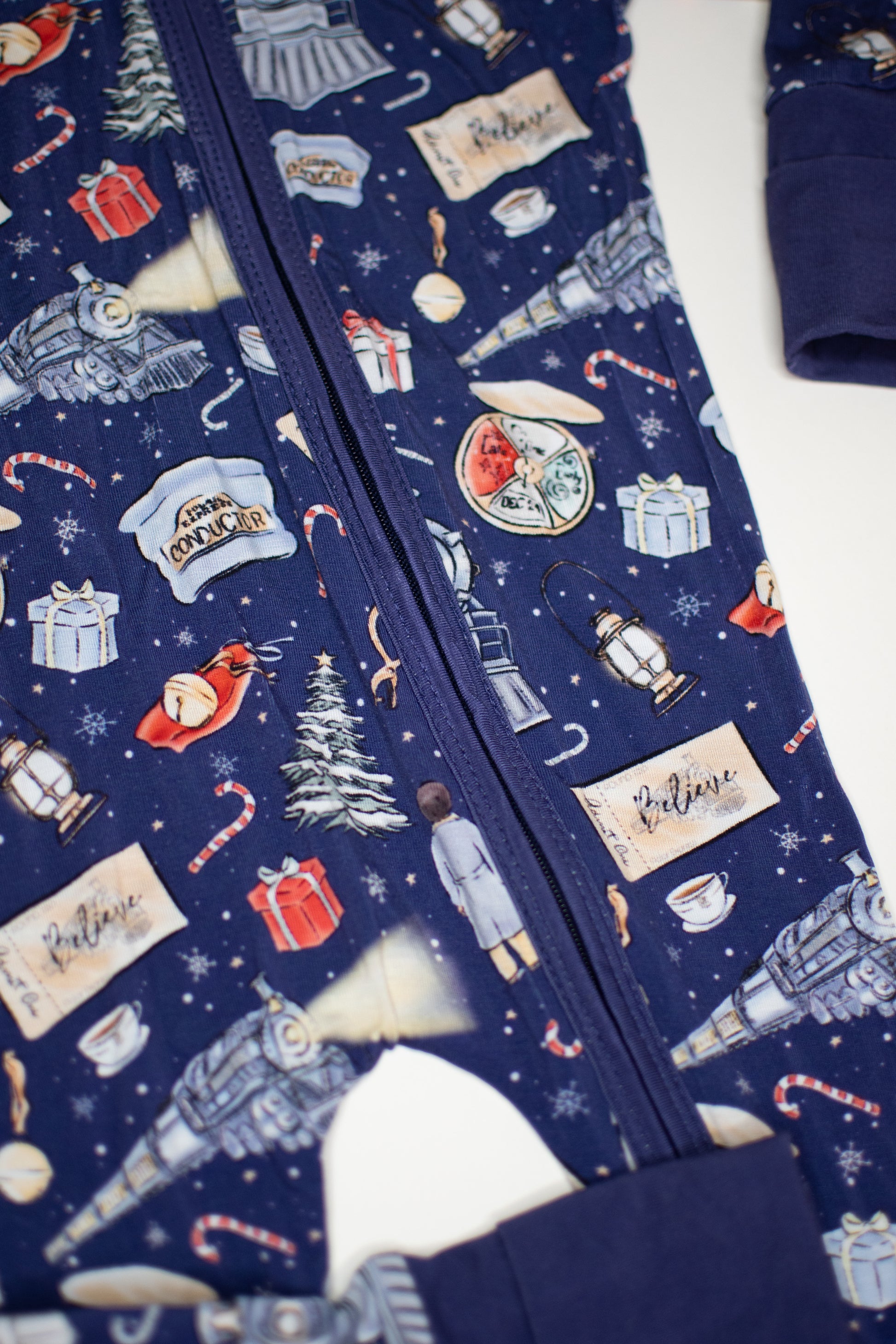 All aboard the magic! Our Ticket to Believe print captures the wonder of Christmas Eve with every charming detail — golden tickets, conductor hats, candy canes, and a gleaming holiday train steaming through a starry night sky. Wrapped in nostalgia and sprinkled with snowflakes, this print celebrates the spirit of believing in Christmas magic — because sometimes, all it takes is a little faith and a cozy pair of jammies to feel the wonder of the season.